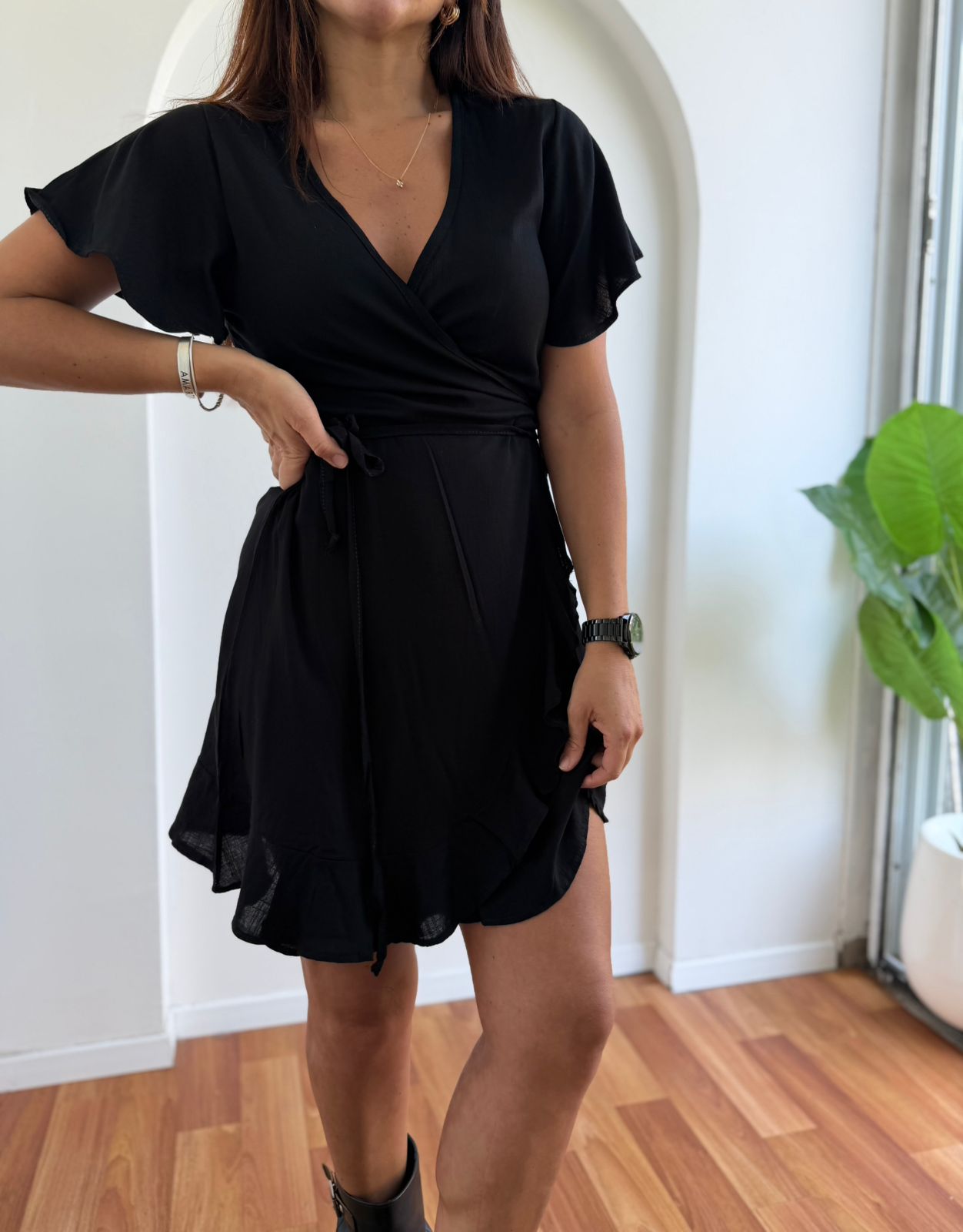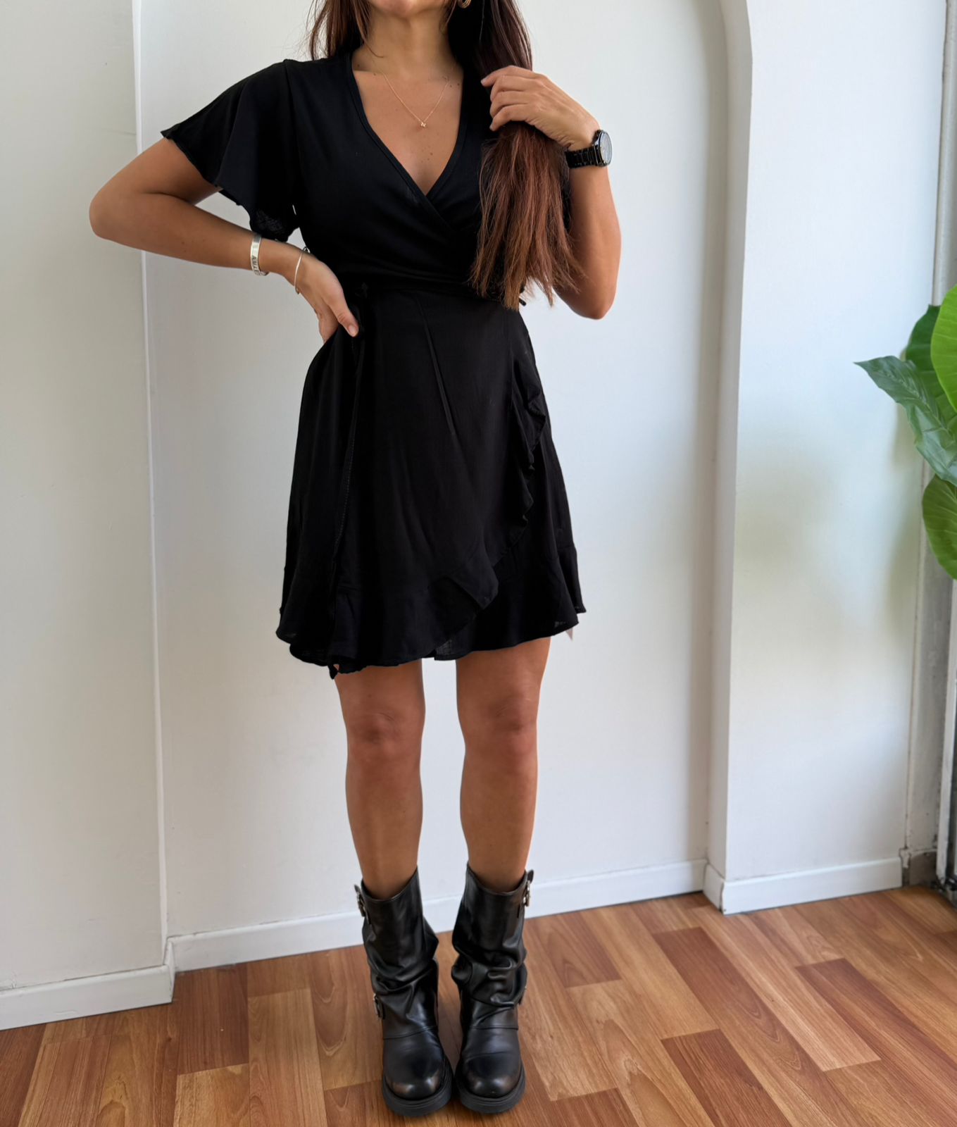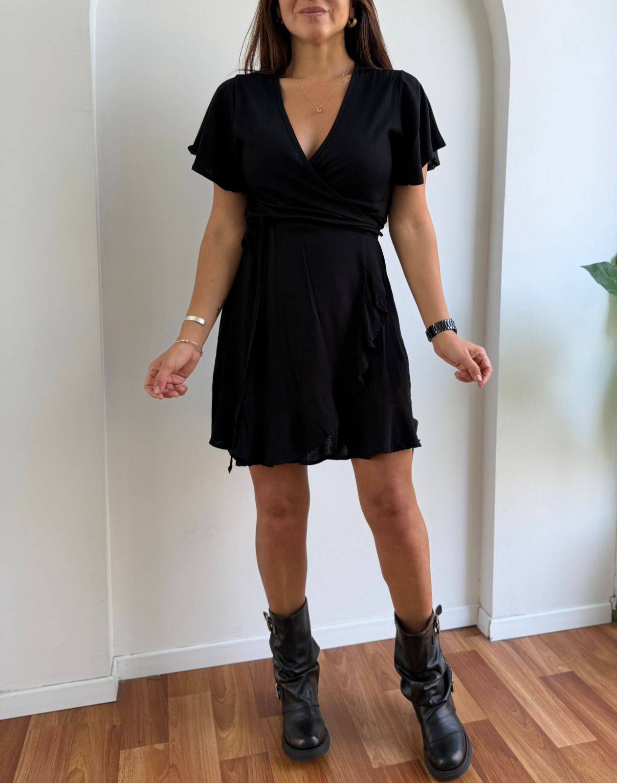 VESTIDO DE LINO GRUZADO CON CORDON Y VOLADO EN MANGAS ARELA