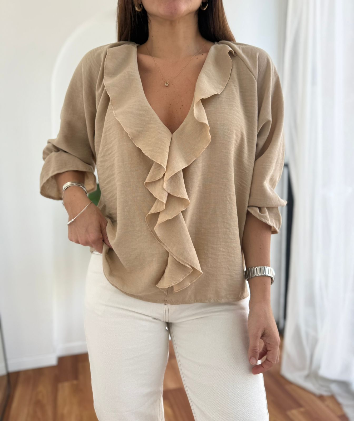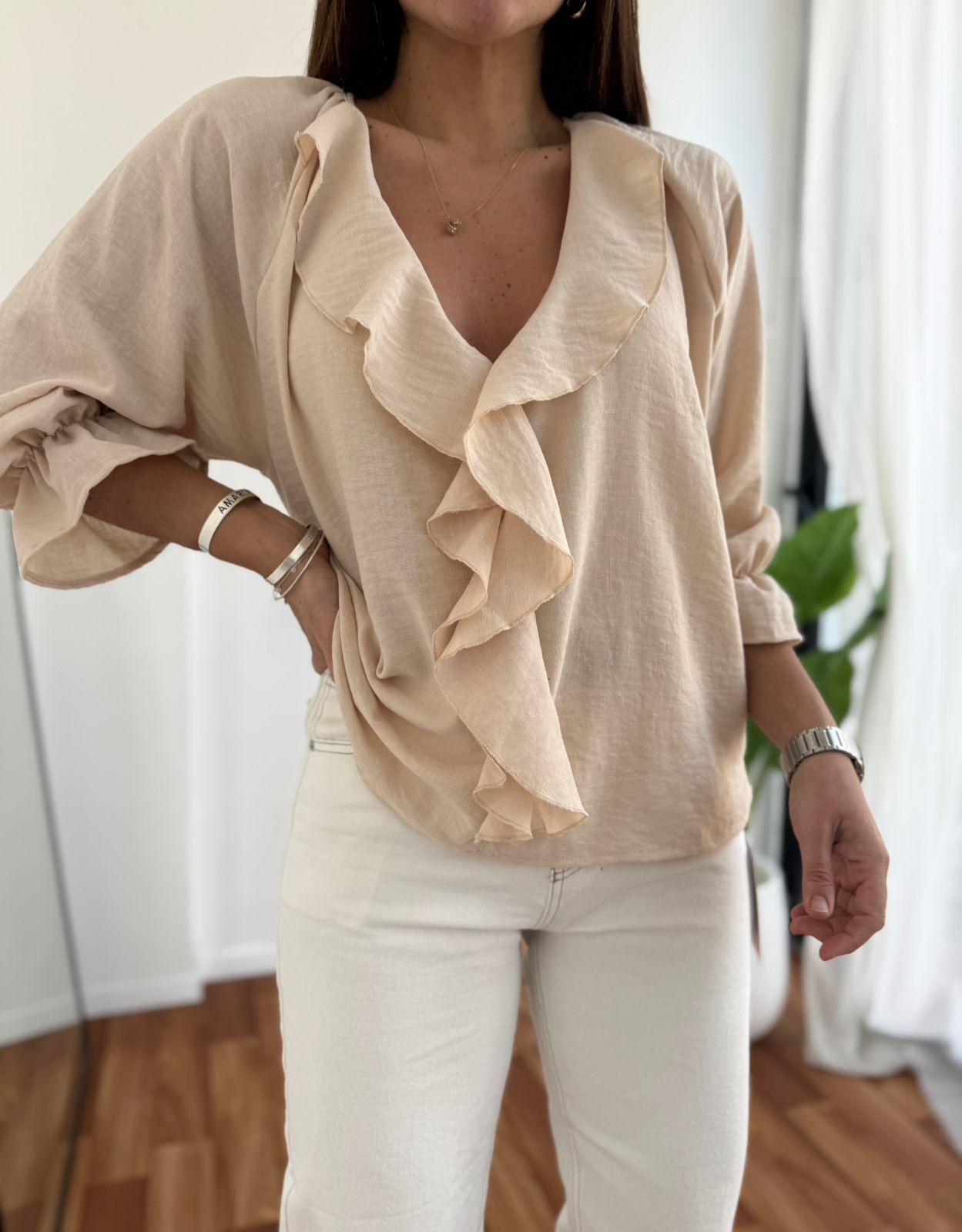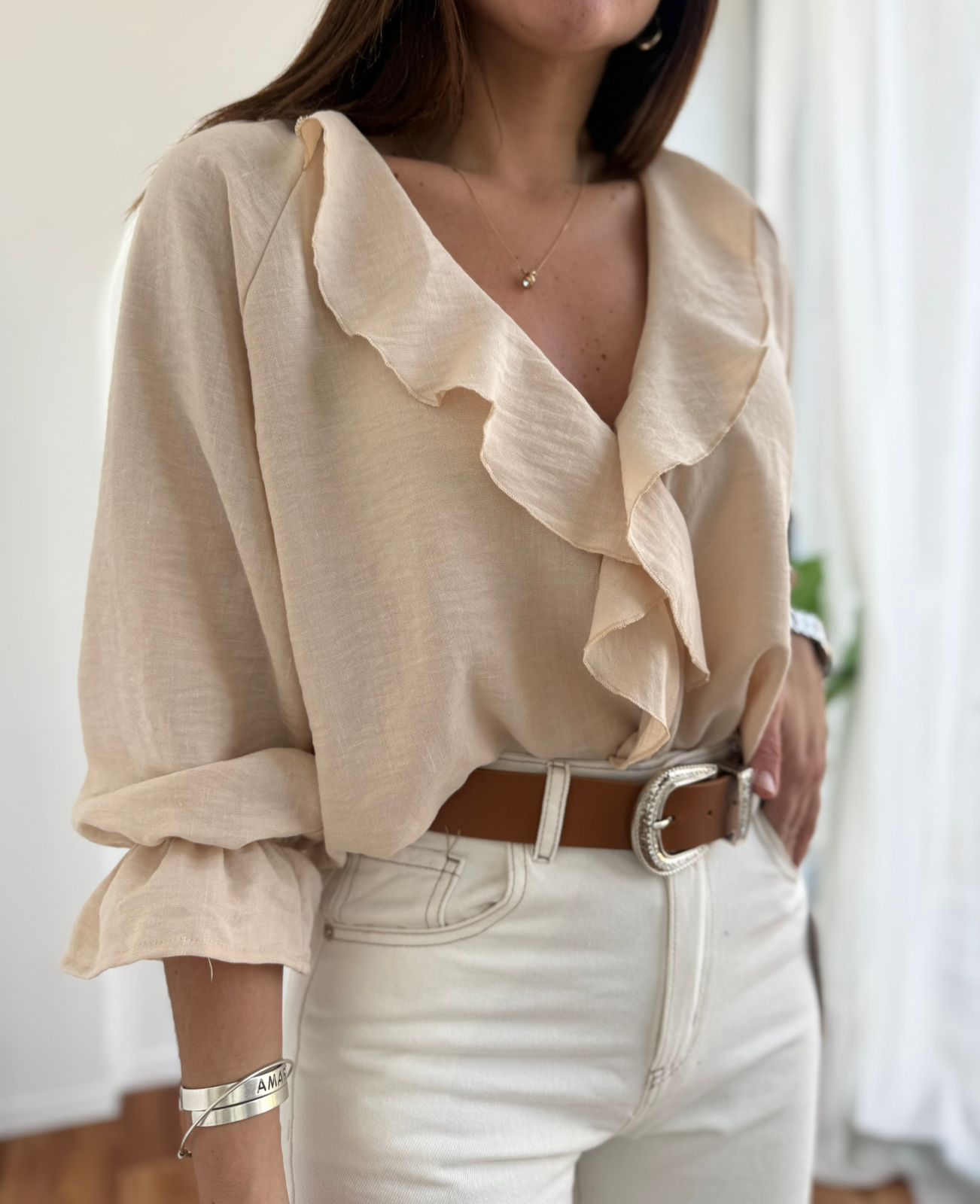 BLUSA DE LINO MANGAS LARGAS CON VOLADOS Y ESCOTE V CUERDA
