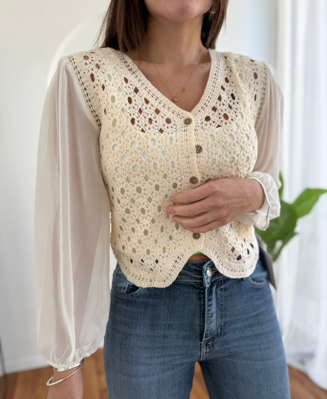 BLUSA TEJIDA CON MANGAS DE GAZA Y BOTONES DEMI