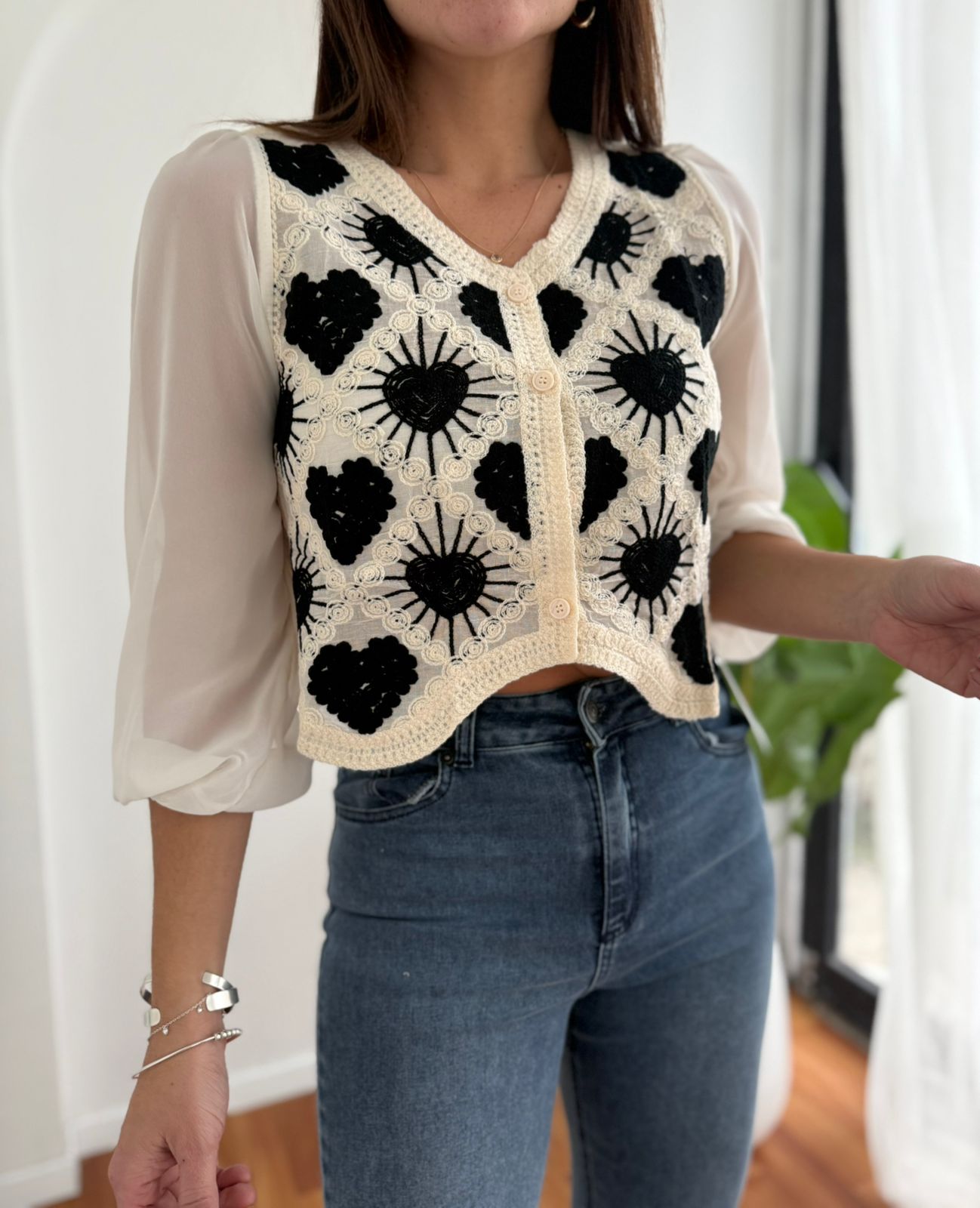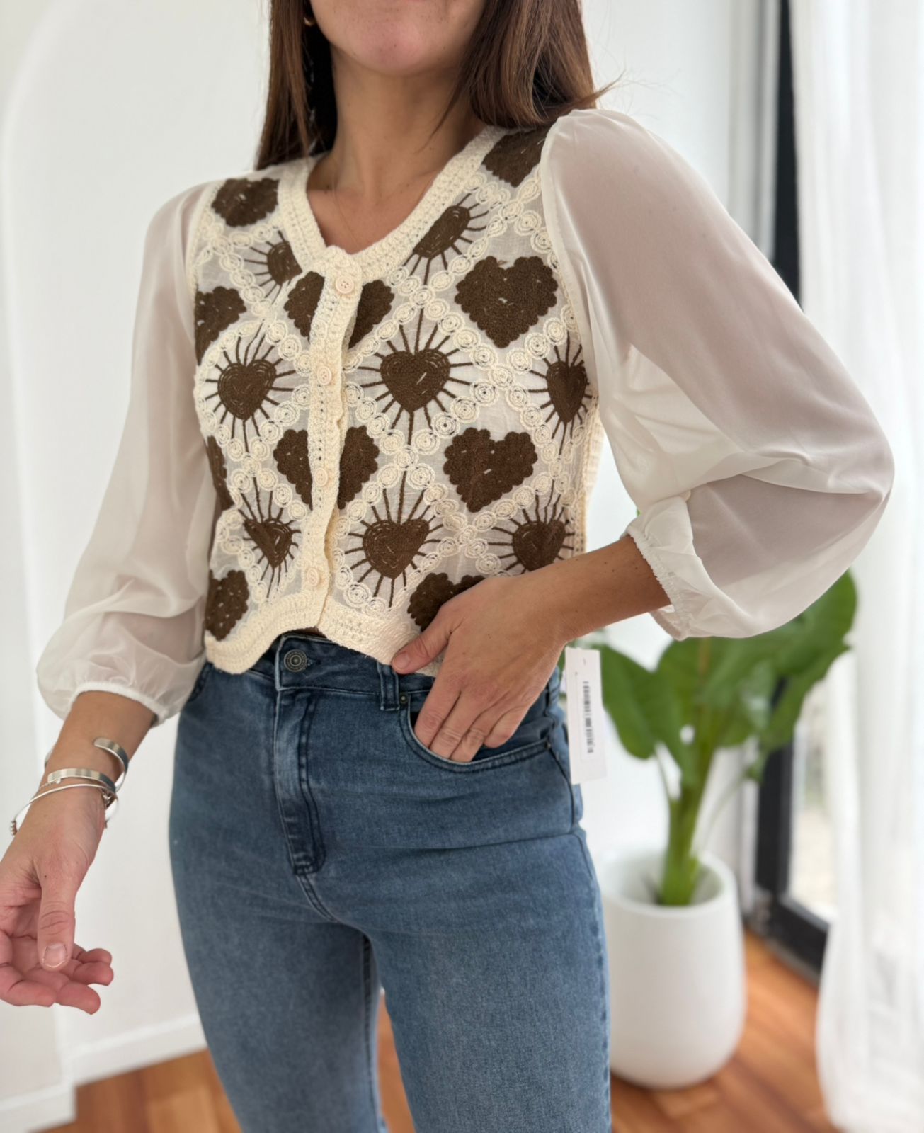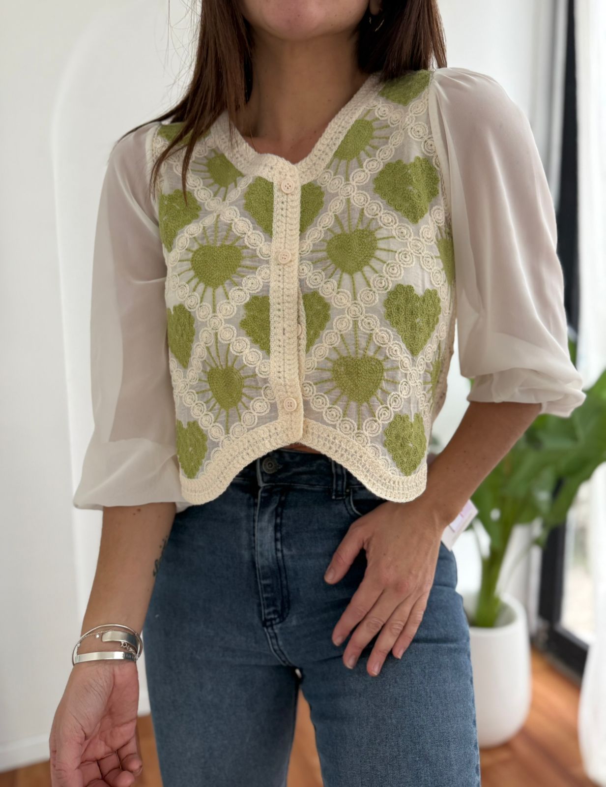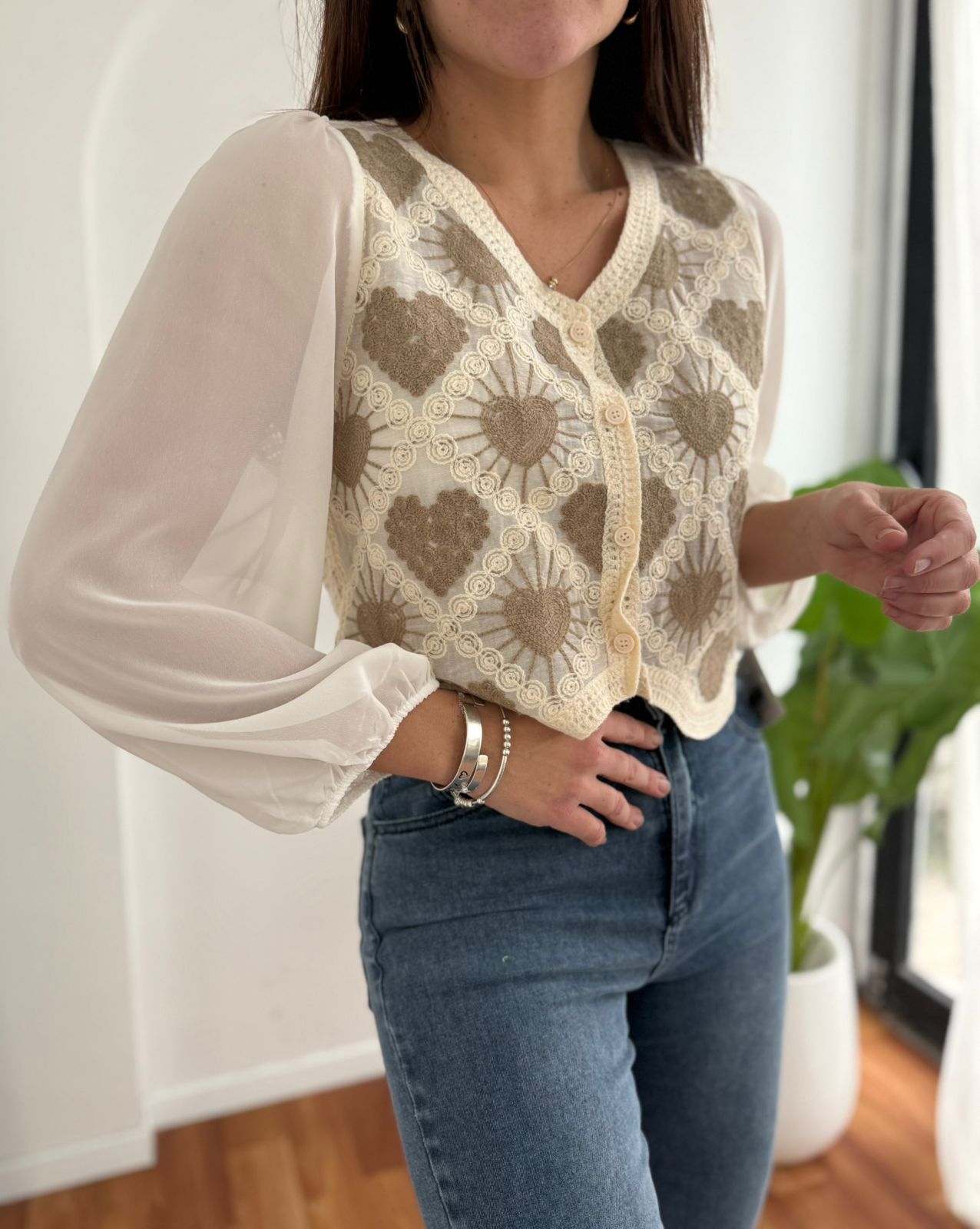 BLUSA CROP TEJIDA CON MANGAS DE GAZA Y BOTONES IRIS