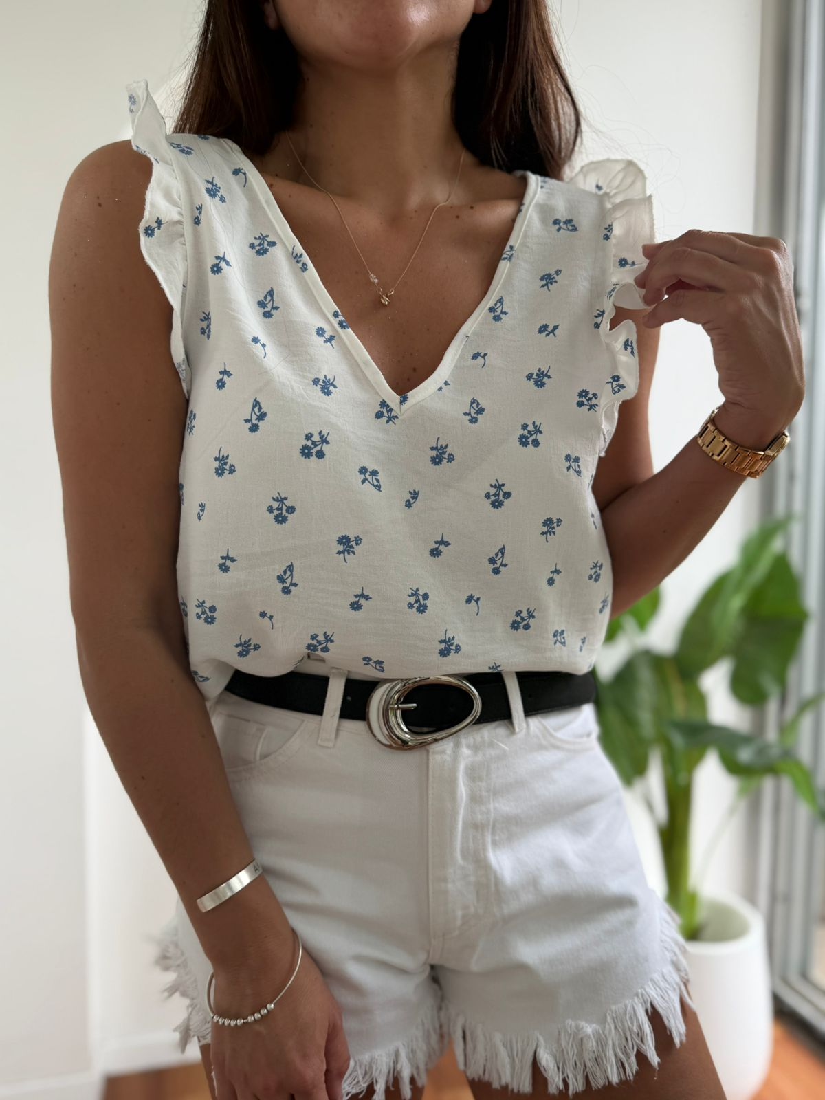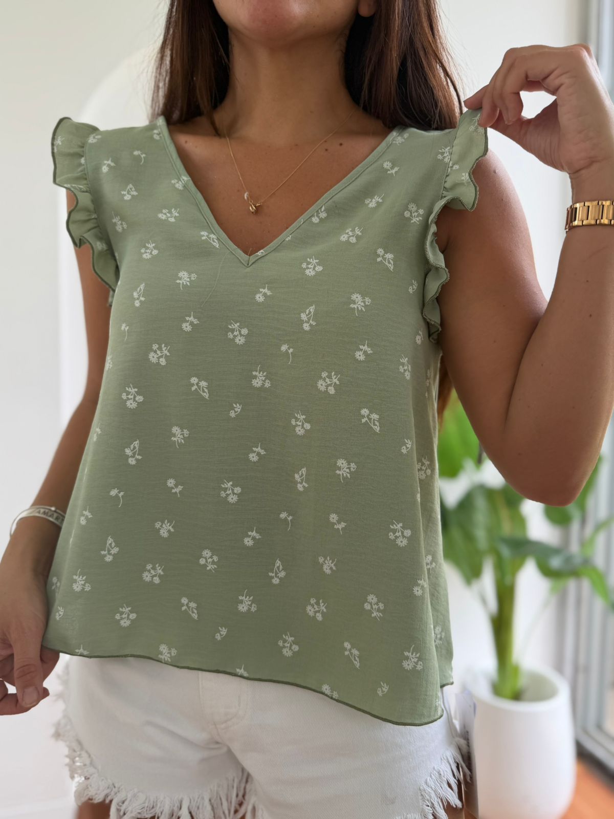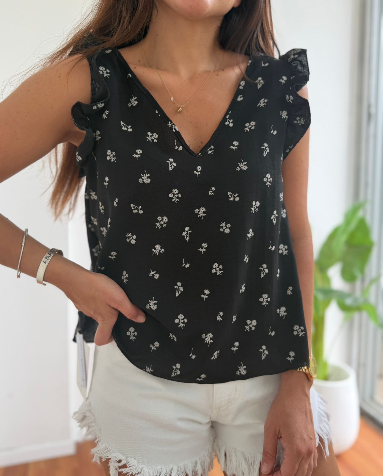 BLUSA DE CREP ESTAMPADA ESCOTE V CON VOLADOS Y CORDON ATRAS MARIA