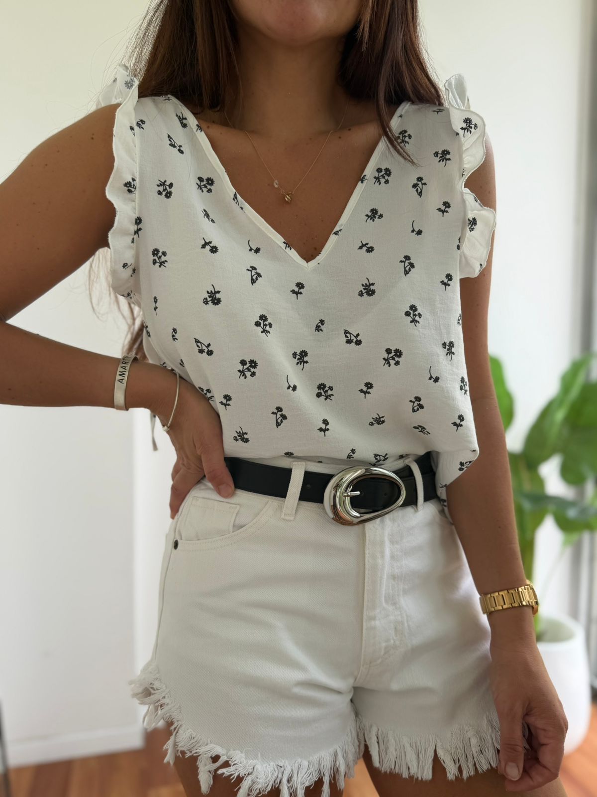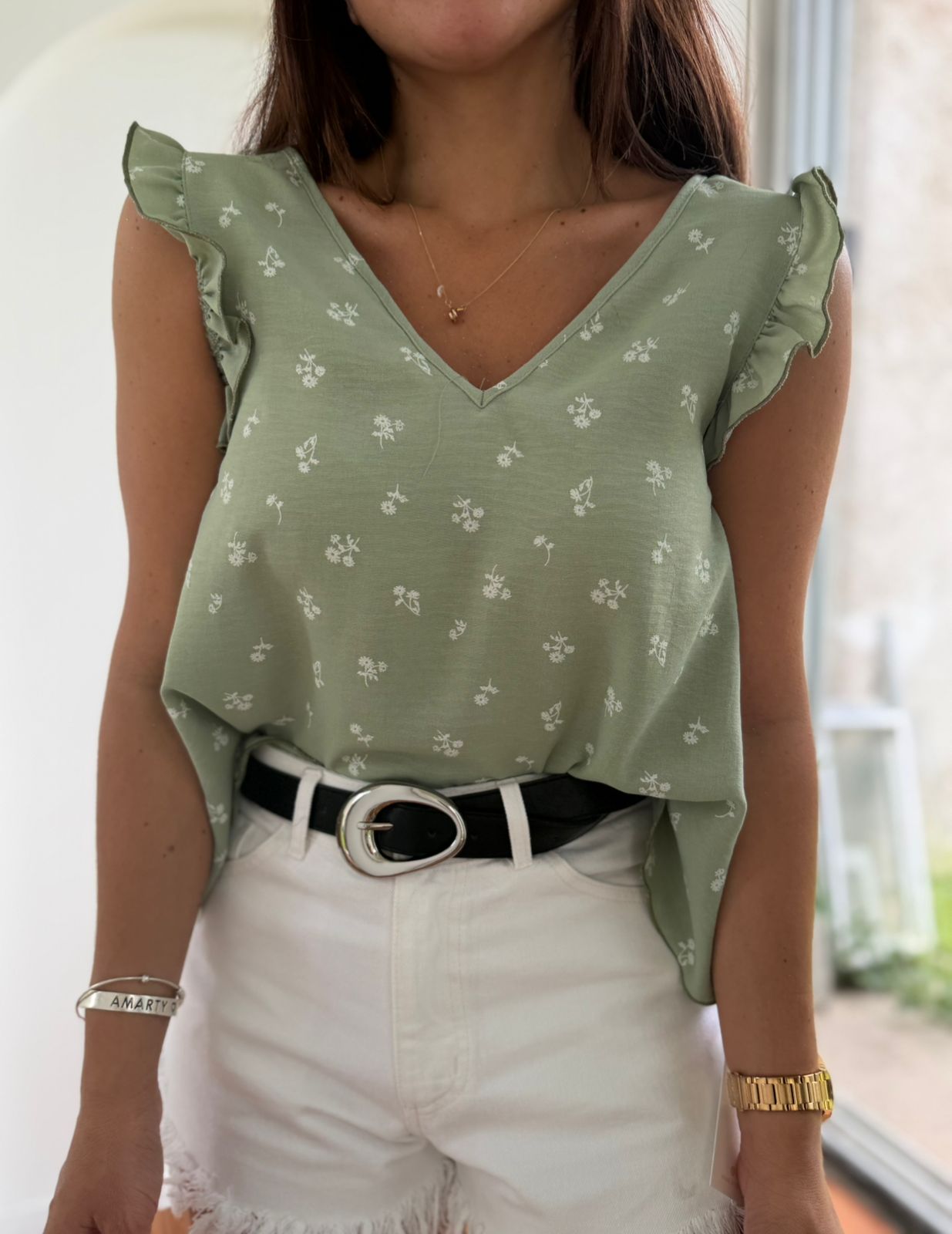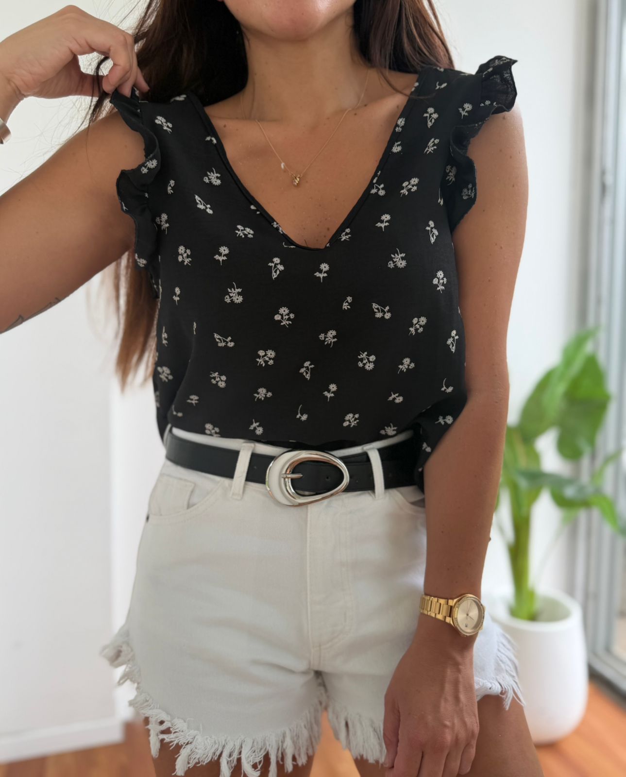 BLUSA DE CREP ESTAMPADA ESCOTE V CON VOLADOS Y CORDON ATRAS MARIA