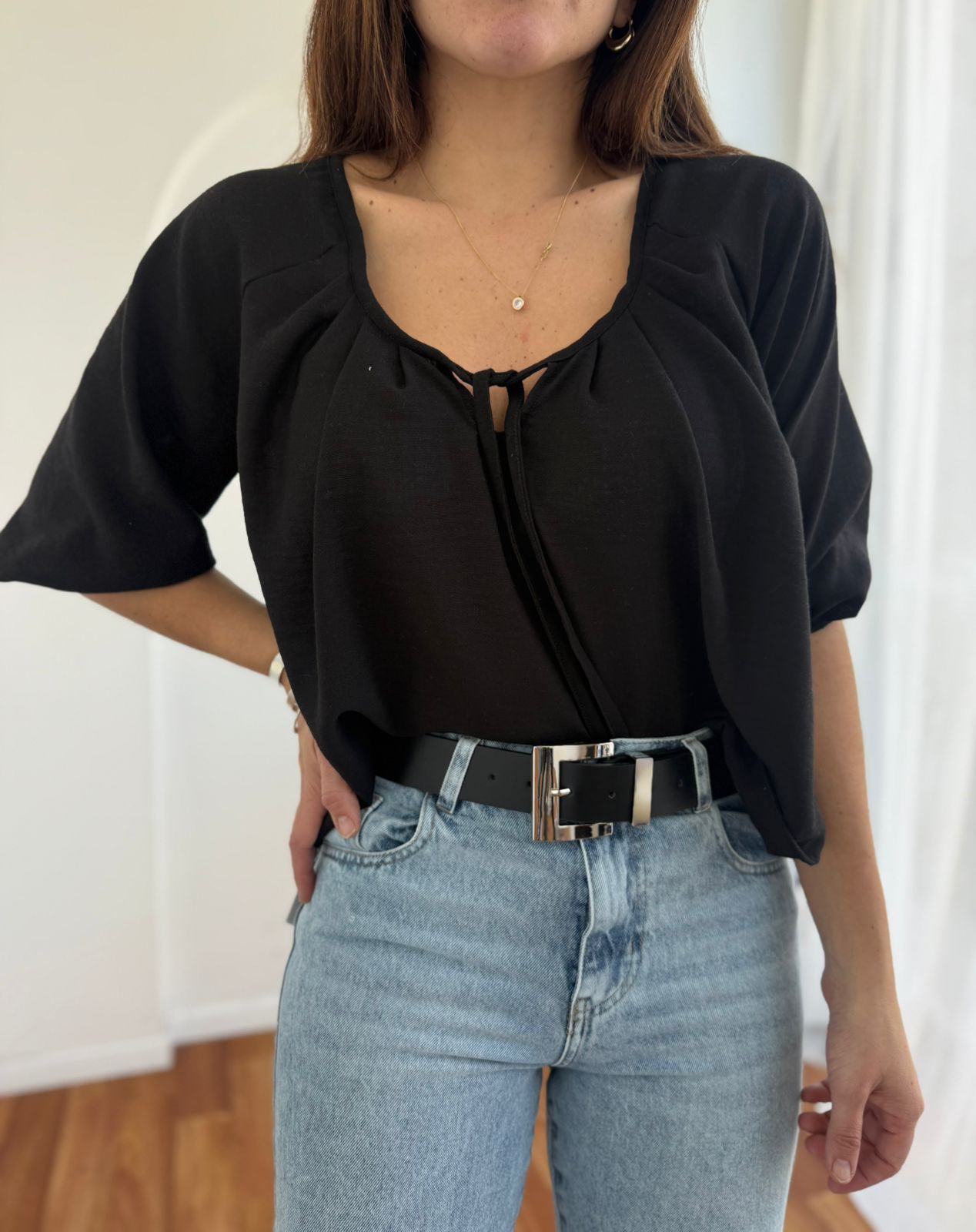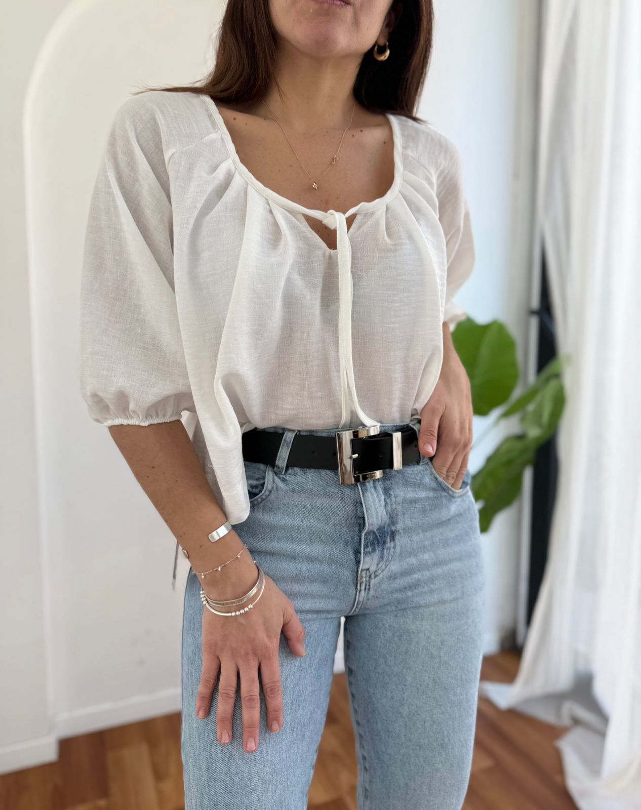 BLUSA DE LINO CON MANGA GLOBO 3/4 Y ESCOTE CON CORDON MIKU