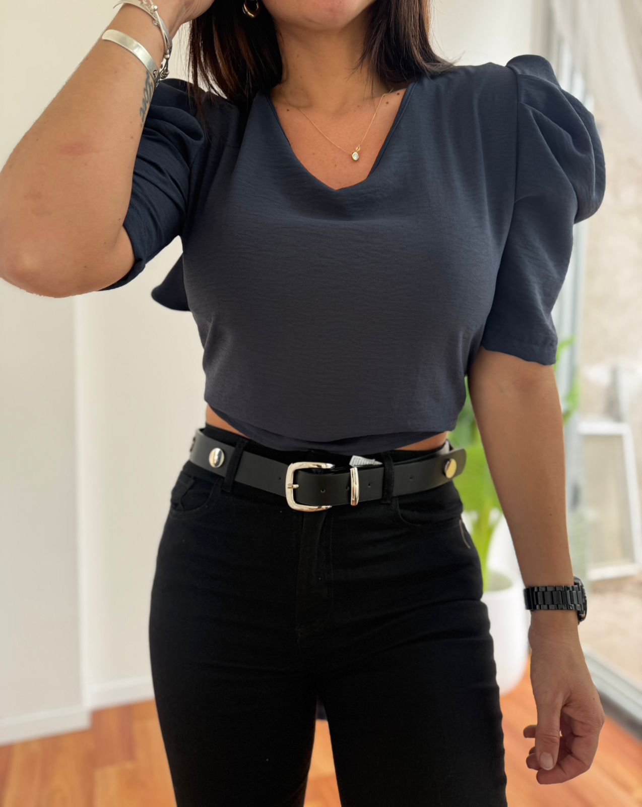 BLUSA DE CREP MANGA PRINCESA CON ESCOTE V Y NUDO EN ESPALDA TAMI