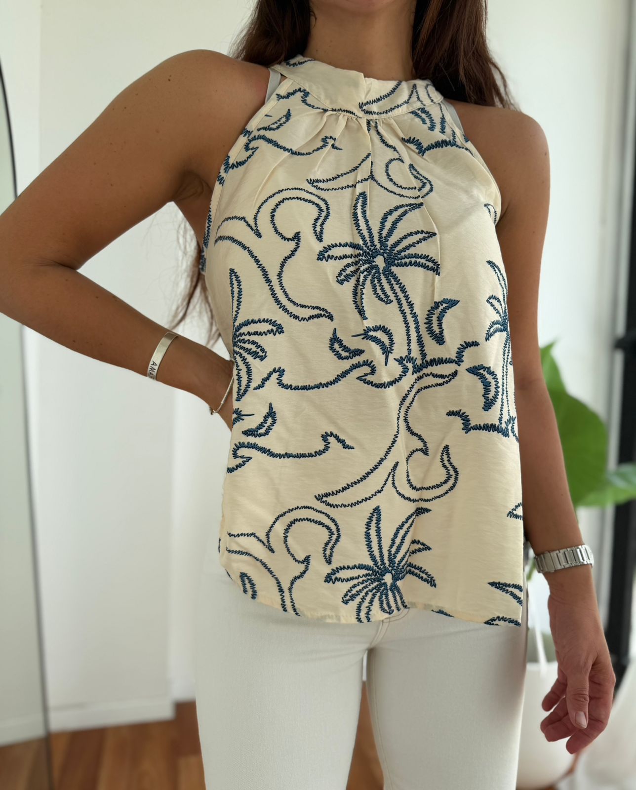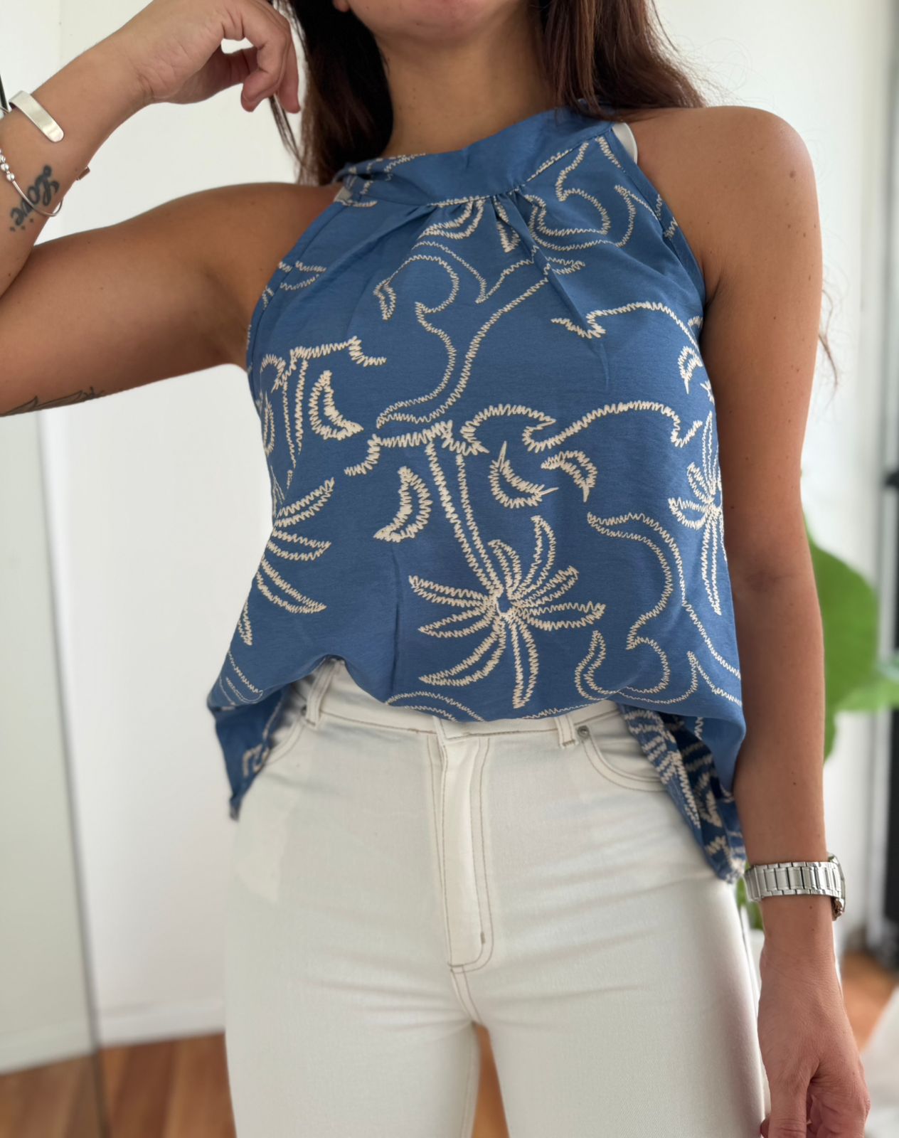 BLUSA DE FIBRANA ESTAMPADA CUELLO AMERICANO CON NUDO WINONA