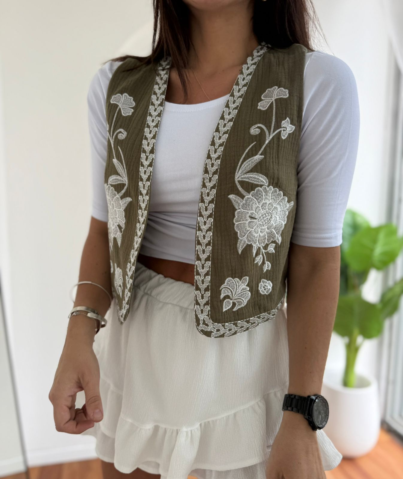 CHALECO DE LINO BORDADO FORRADO POR DENTRO PEONY