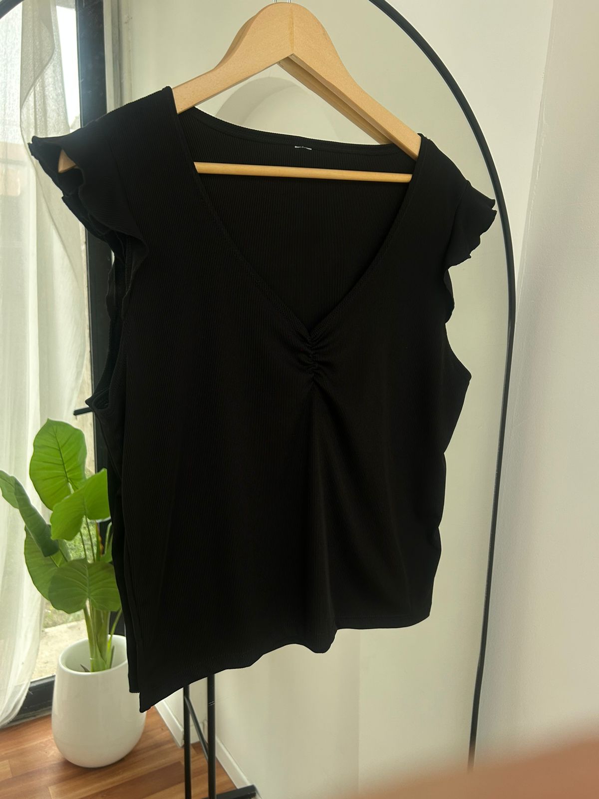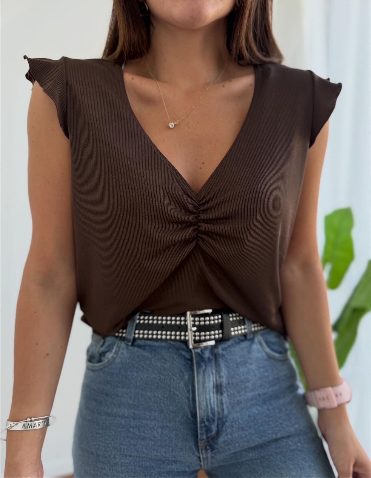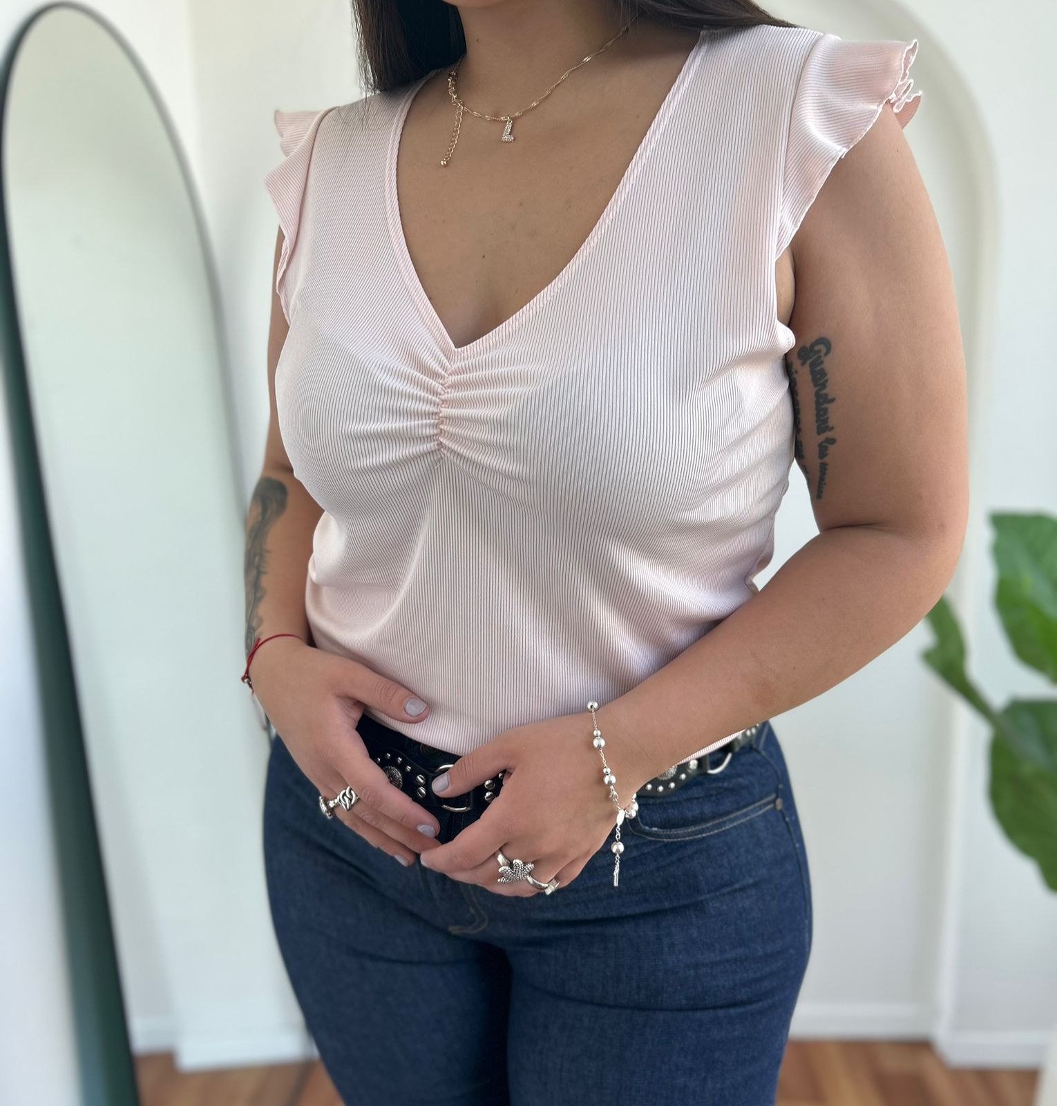 MUSCULOSA DE MORLEY LYCRA CON VOLADOS Y ESCOTE V CON FRUNCE CRISTINA