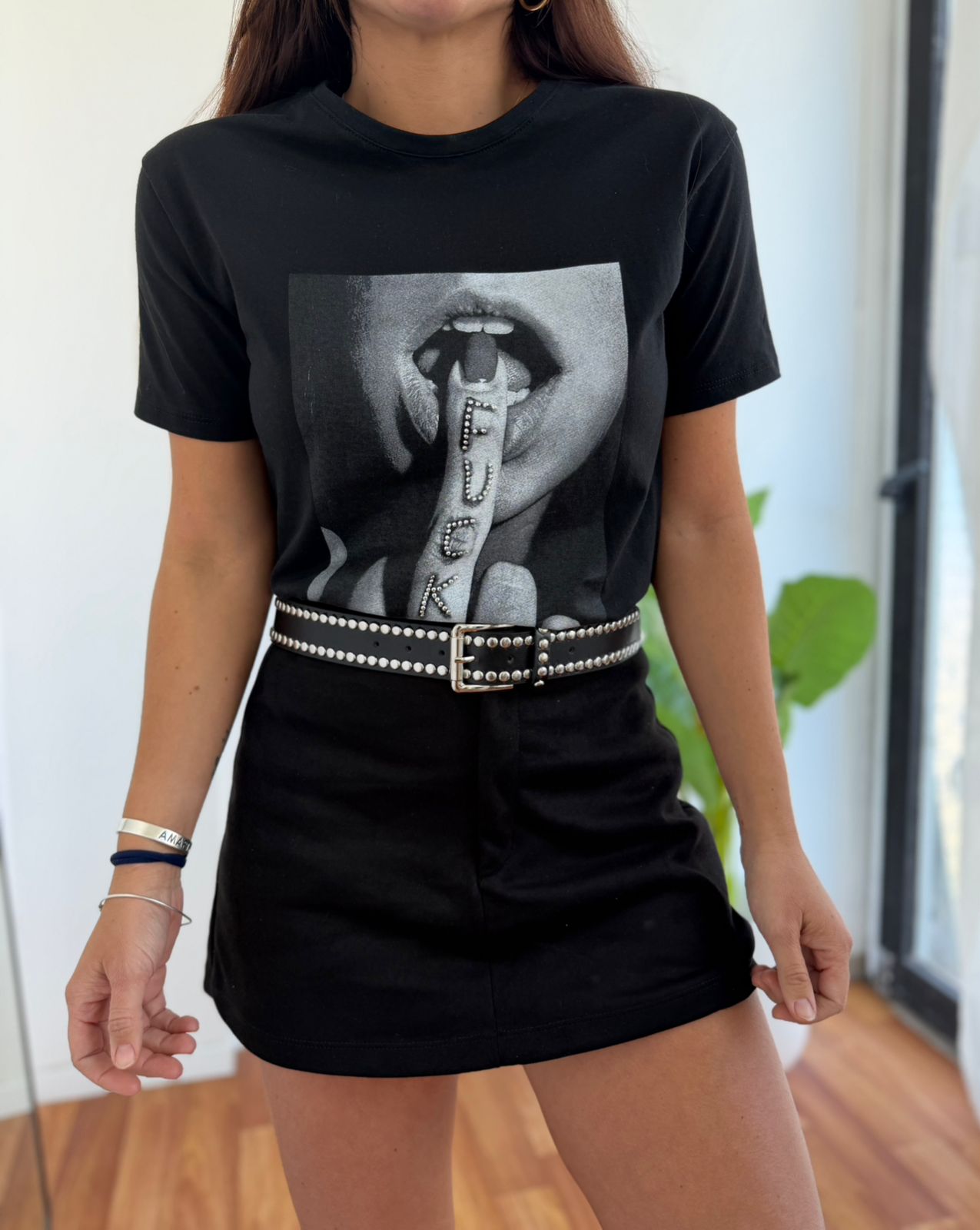 REMERA MANGAS CORTAS DE ALGODON ESTAMPADA CON STRASS FUCK YOU