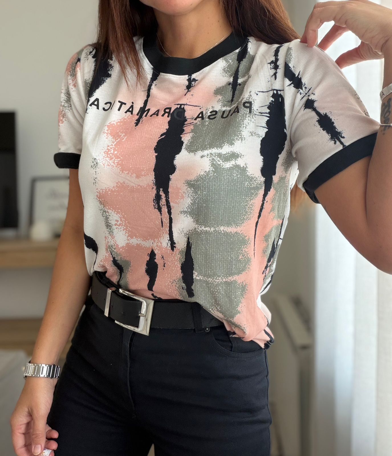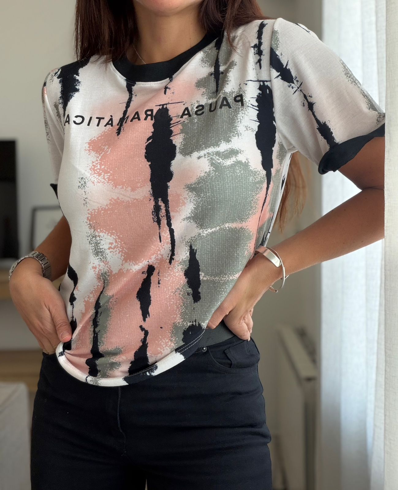 REMERA DE MODAL SUBLIMADA Y CON ESTAMPA PAUSA DRAMATICA